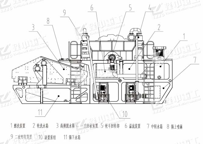 物料先經過擦洗機進行擦洗,除去砂顆粒表面附著的泥粉;擦洗后的物料進入輪洗洗砂機進行二次清洗;擦洗機和輪式洗砂機溢流水進入副水箱進而進入旋流器進行細砂回收,同時將擦洗和洗砂過程中的泥水由旋流器反水口溢流到尾水處理系統。經過擦洗機和輪式洗砂機清洗后的粗、細砂進入脫水篩進行脫水,脫水篩下水箱的水由泵送入旋流器進行第二次細砂回收,同時將泥水由旋流器反水口溢流到尾水處理系統。