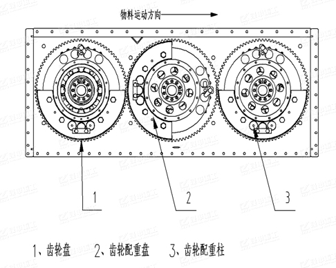 三軸橢圓篩的激振器是由三根并列的振動軸組成,位于篩箱一側的振動軸的一端裝有速比為1的互相嚙合的三個齒輪; 振動篩工作時,電機皮帶傳動裝置帶動激振器的三個齒輪旋轉,由于三根軸上均裝有相等的偏心質量、相同的偏心半徑的配重盤,由等參數的齒輪同步連接,因此篩箱的運動軌跡呈現為橢圓形,即單軸振動篩的圓運動軌跡和雙軸振動篩的直線運動軌跡的合成運動軌跡。橢圓的運動軌跡可以使物料擁有更大的運行速度,提高設備的產量。